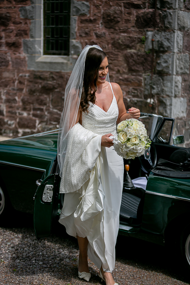Bride pictured smiling at the camera sitting in a dark green cabriolet in Kenmare.