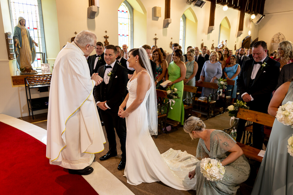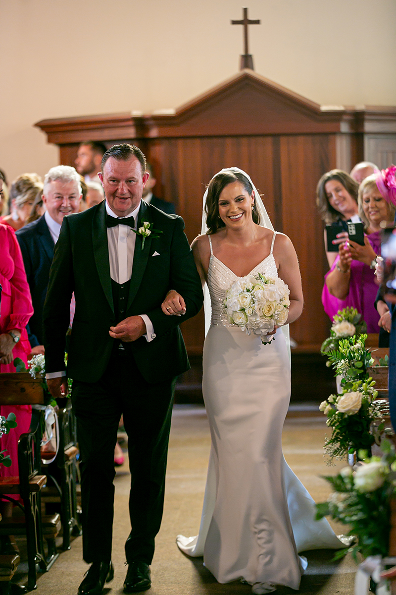 Black and white portrait of bride and groom walking back down the aisle in Kenmare.