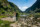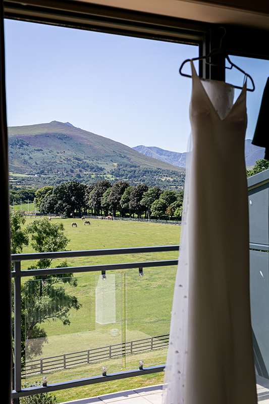 portrait photo of wedding dress hanging by window overlooking a mountain view