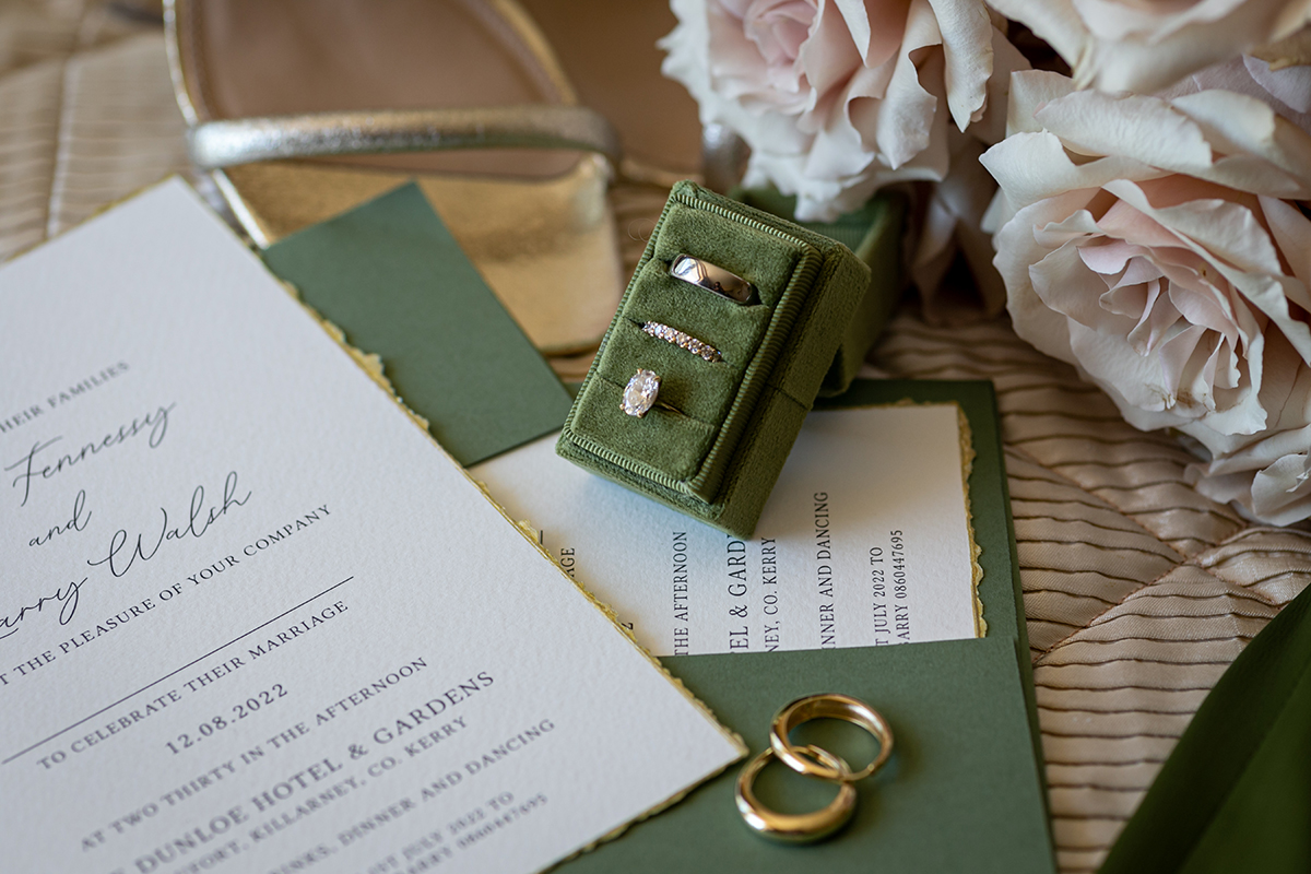 bride and grooms wedding rings in a green ring box placed next to wedding invitation