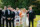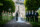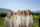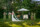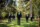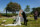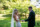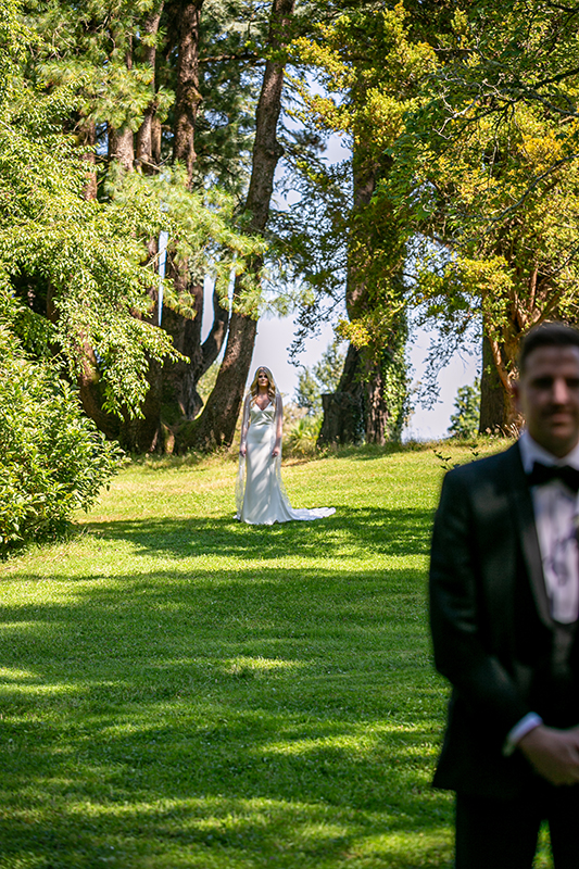 groom stood in foreground and the bride walking towards him from background surrounded by green grass and trees