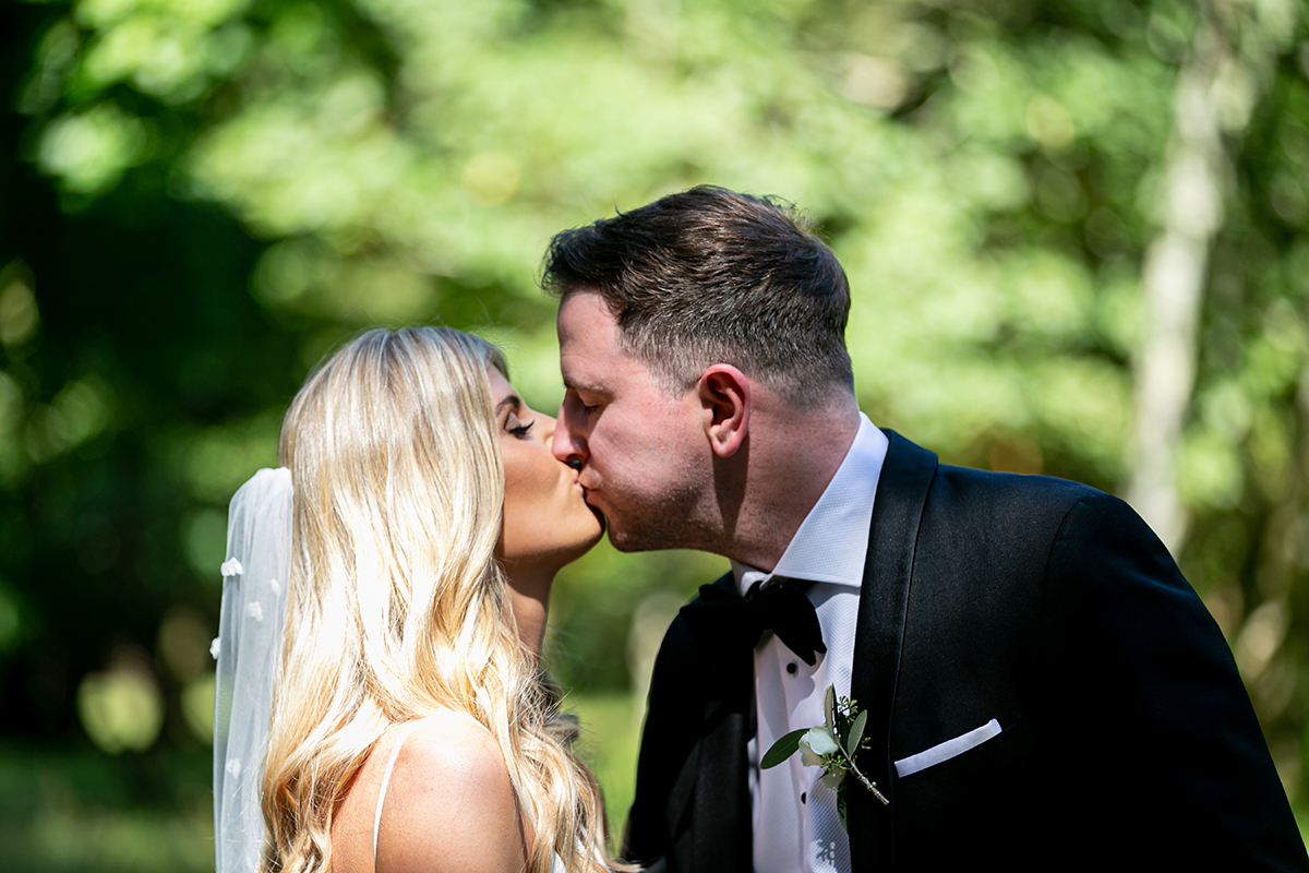 bride meets groom at the end of the aisle of their wedding set in the gardens of the dunloe hotel with wooded areas in the background