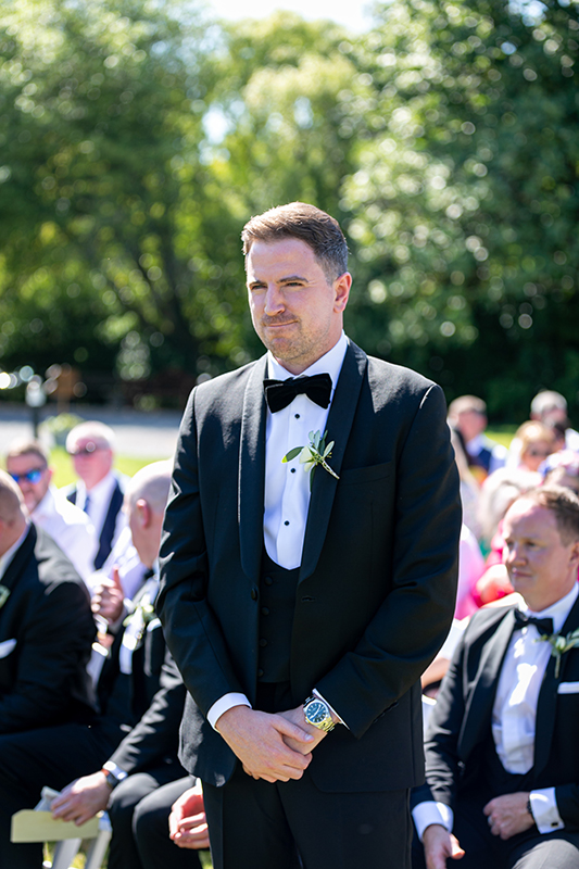 portrait of the groom waiting at the alter set outdoors in the sunshine