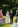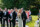 The groom with his groomsmen stood interspersed in a green clearing with woods in the background on a sunny day