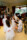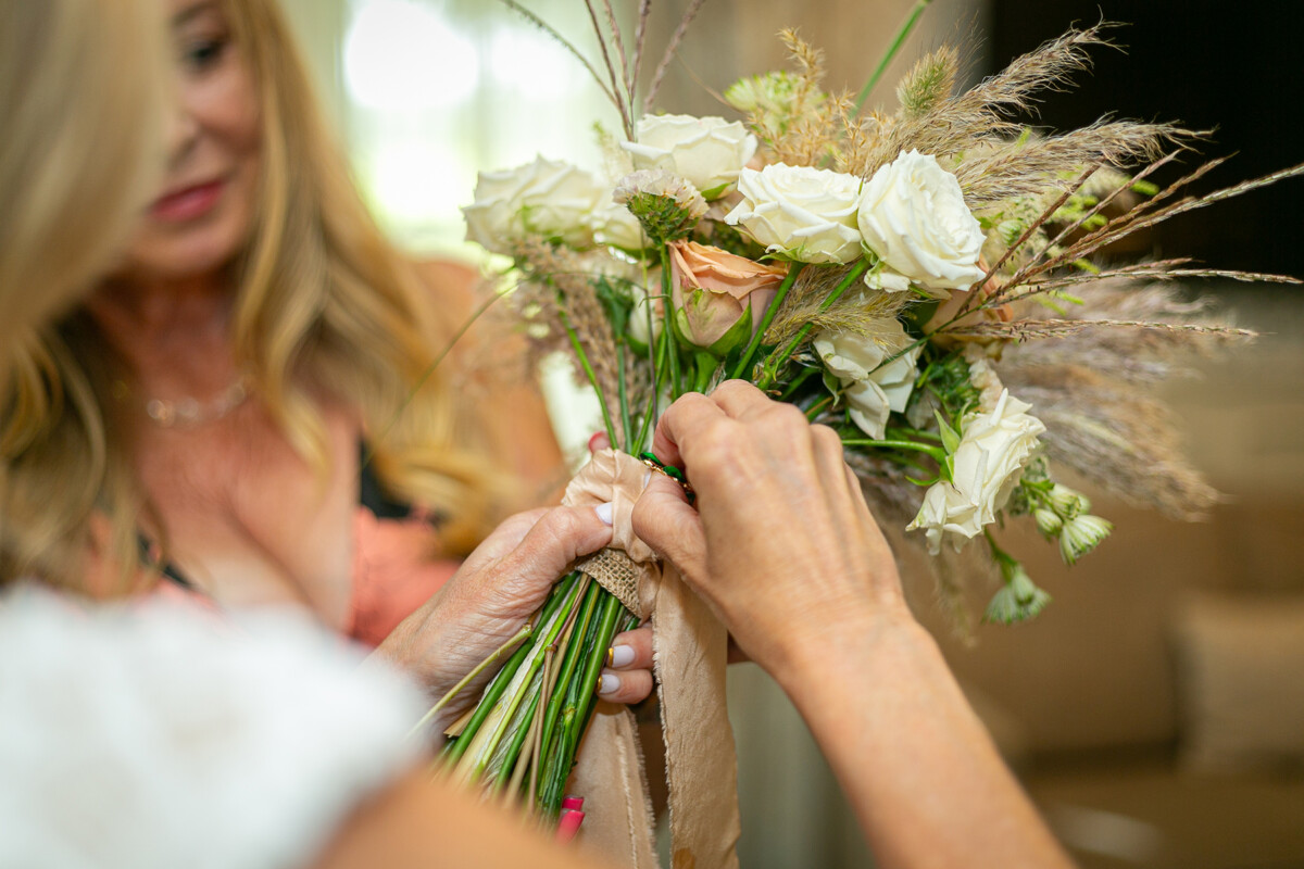 Close up shot of a lady tying ribbon to the bouquet for the vow renewal, the bouquet consists of white and soft pink roses and pampas grass.