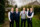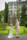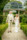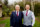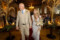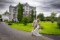 Husband and wife are pictured walking along a path lined by green hedges towards the camera with the stone gazebo, hedges and trees of Ballyseede castle gardens in the background.
