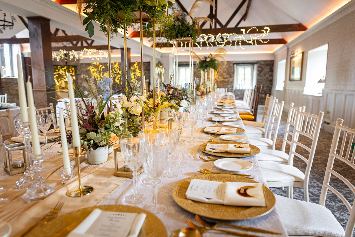The dining hall at Ballyseede castle is decked out beautifully for a vow renewal with glassware and golden plates lining the table accented by pretty florals.