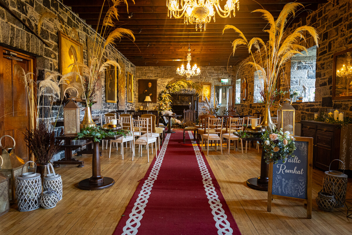 Ceremony room at Ballyseeede castle, decorated beautifully with autumn colours, pampas grass and a rustic style.