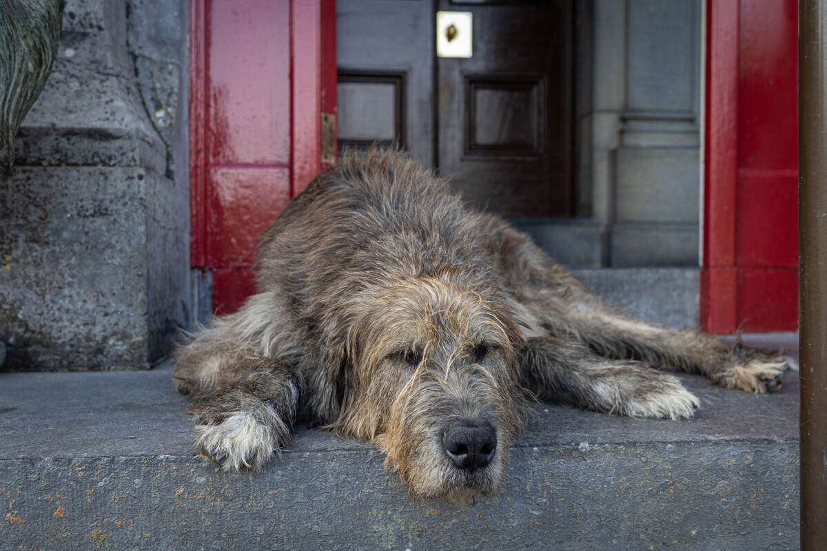 Close up picture of an Irish wolfhound sleeping soundly on the steps of Ballyseede Castle Hotel, Tralee.