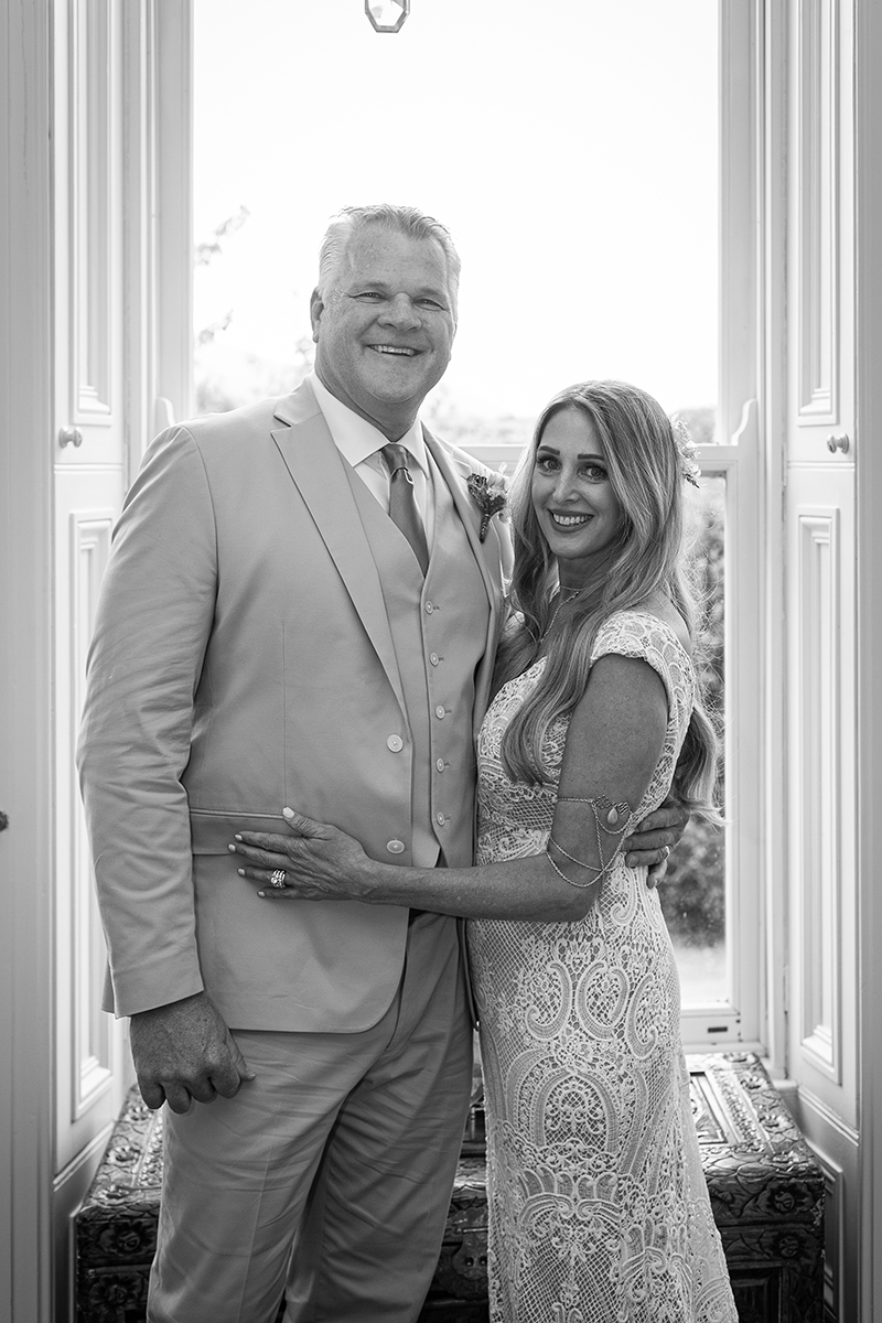 Husband and wife stand arm in arm in the stone gazebo at Ballyseede castle, lit by a chandelier.