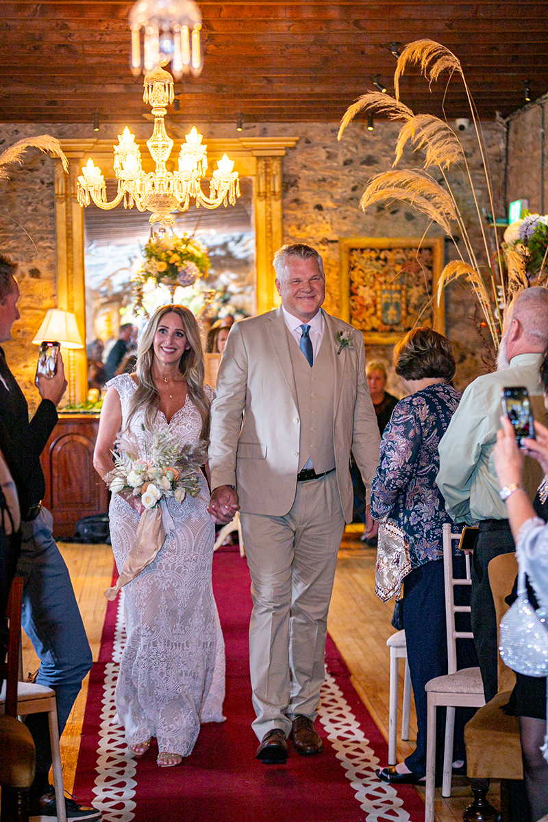 Husband and wife walk down the aisle at their wedding vow renewal ceremony at Ballyseede castle, Tralee.