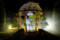 Nighttime shot of husband and wife standing in the centre of the stone gazebo at Ballyseede castle hotel.